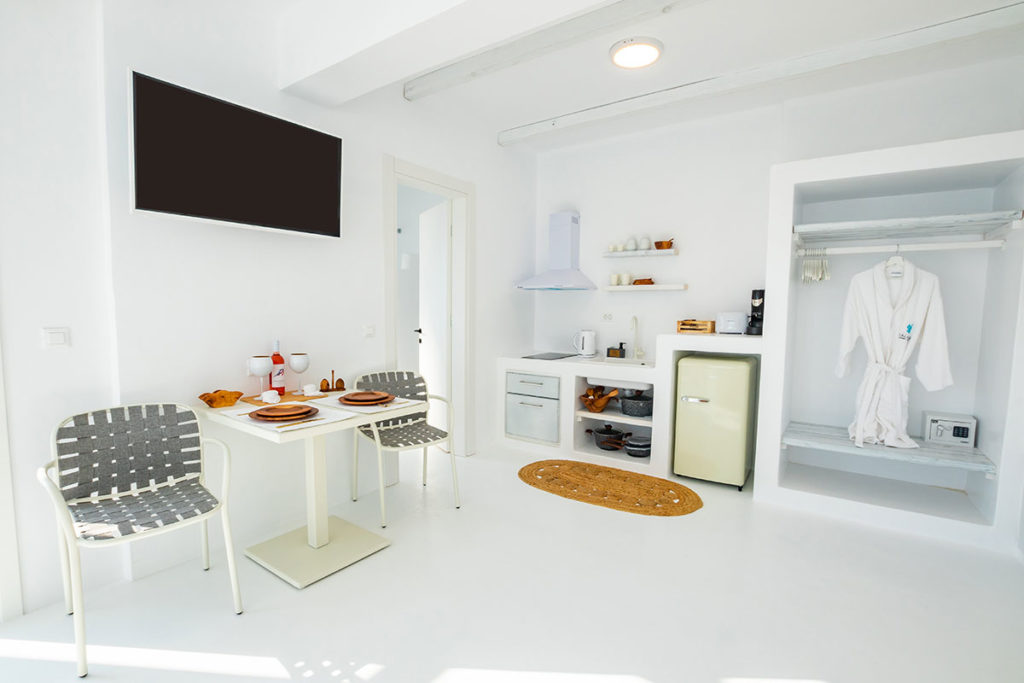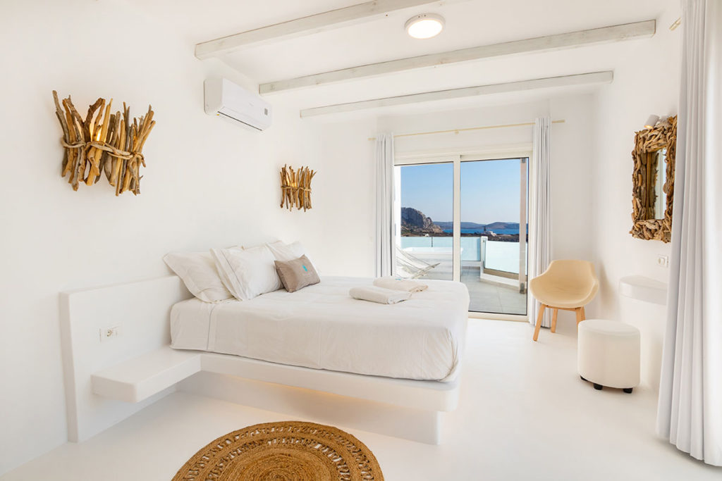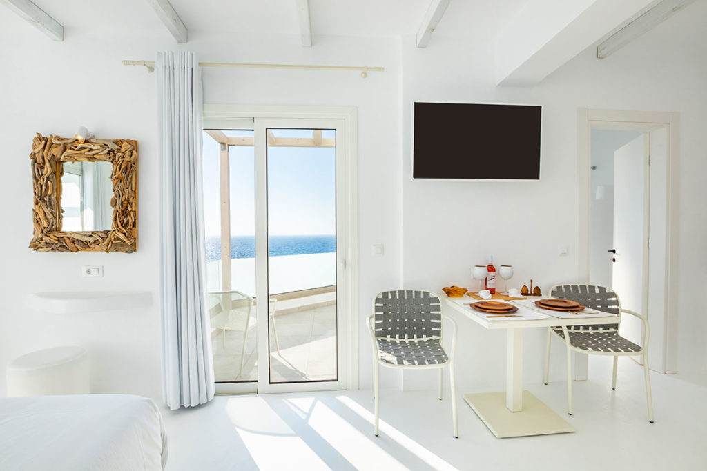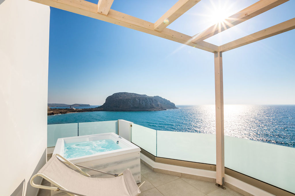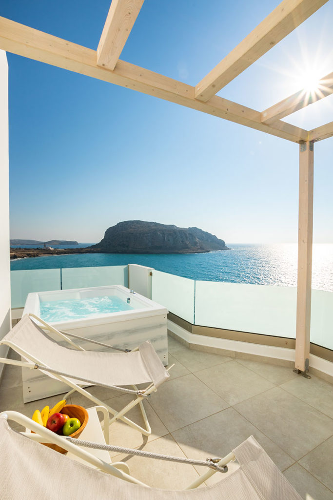 This suite includes a private outdoor Jacuzzi with two balconies and full ocean view. The suite is approximately 39 sq. meters and contains double bed, mini kitchen along with indoor/outdoor seating and sun beds.